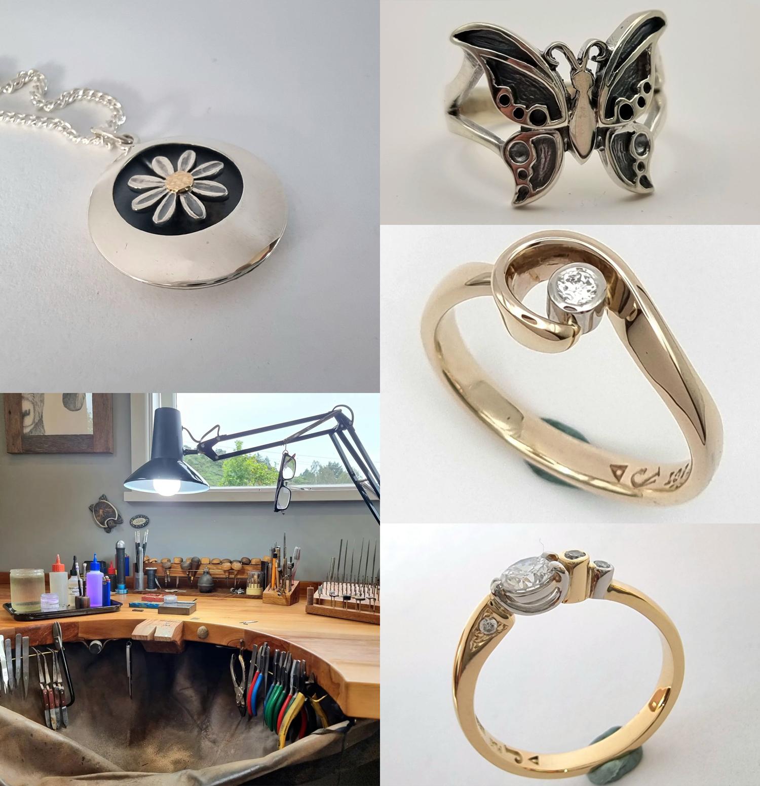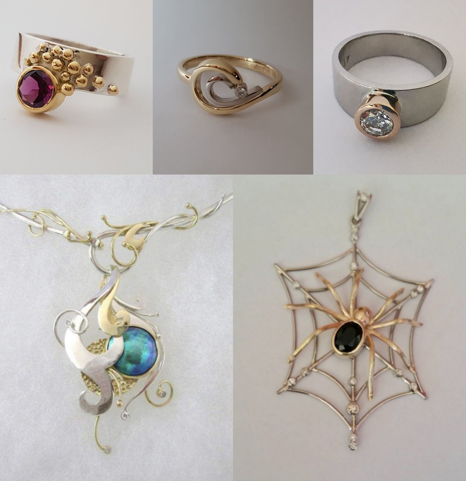 Janine started her career in 1986, aged 16, at Daniel's Jewellers in Dunedin. At the time she was Dunedin's first female apprentice. During her apprenticeship she did several rounds of the NZ Skills competitions that were open to 22 year olds and under in various trades. One her second attempt, she won silver in the nationals, and in her third and final time before she turned 22, she won the nationals and was eligible to participate in the International Skills competitions in Amsterdam in 1991. "Since then, I've worked in Greymouth on the West Coast and Balclutha in the south before being drawn back to Dunedin where I was born and bred. Since 1995 I have had a studio at home and work from there in a beautiful creative space. Inspiration can come from anywhere. I'll see a shape that appeals, be it in nature or man-made, and that's enough to spark an idea. I consider myself lucky to be able to make pieces for people that will endure decades - it is such a privilege."